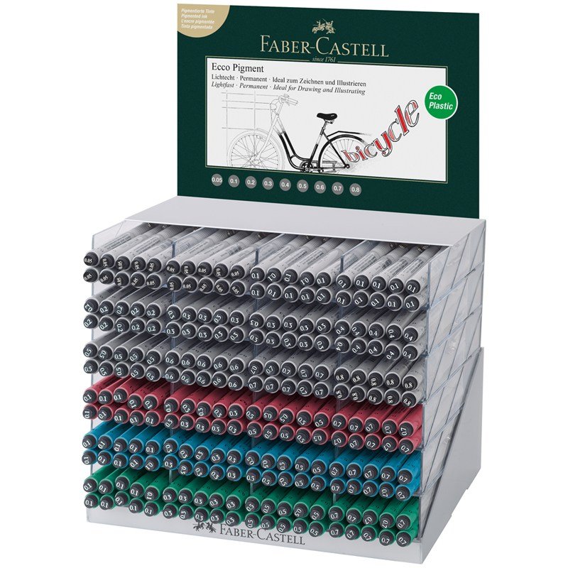 Капиллярные ручки Faber-Castell "Eco Pigment" разных цветов представлены в дисплее - 240 шт. Чернила перманентные, светостойкие, пигментированые.