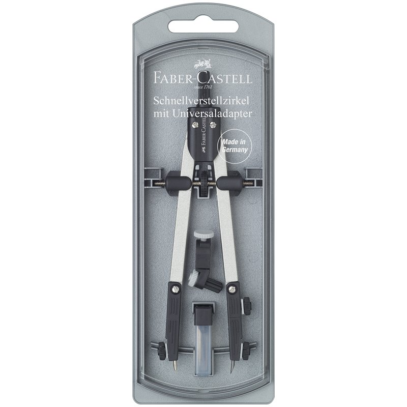 Циркуль Faber-Castell дает возможность точно чертить окружности радиусом до 170мм, имеет дополнительный фиксатор радиуса. Циркуль изготовлен из металла и пластика. В наборе есть универсальный держатель и запасные стержни. Футляр, в котором располагается набор из 3 предметов, надежен и практичен.